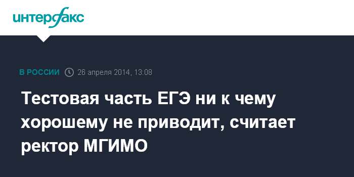 Москва. 26 апреля. INTERFAX.RU - Ректор МГИМО (У) Анатолий Торкунов поддерживает идею министерства образования и науки РФ убрать тестовую часть из ЕГЭ. "Я поддерживаю (отказ от тестовой части А в ЕГЭ -ИФ). Дело в том, что какие-то тесты все равно будут сохранены наряду с письменной частью. Когда ставятся галочки, это ни к чему хорошему не приводит - мы видим это по студентам", - сказал ректор в эфире телеканала "Россия 24" в субботу.