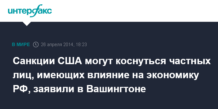 Москва. 26 апреля. INTERFAX.RU - Новые американские санкции в отношении РФ могут коснуться лиц, контролирующих банковский и энергетический сектора экономики, и их компаний, сообщают в субботу западные СМИ со ссылкой на советника президента США по внешней политике Бена Родса. "Санкции могут быть направлены против частных лиц, имеющих влияние на российскую экономику, в частности на банковский и энергетический сектора", - сказал Родс.