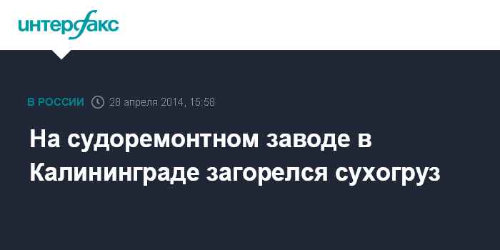 Москва. 28 апреля. INTERFAX.RU - На территории судоремонтного завода "Преголь" в Калининграде загорелся сухогруз. К тушению пожара привлечены несколько пожарных расчетов.