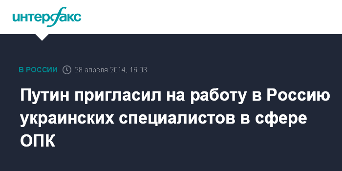 Москва. 28 апреля. INTERFAX.RU - Высококлассные украинские специалисты в сфере оборонно-промышленного комплекса при желании найдут себе достойное применение в России и могут рассчитывать на поддержку при обустройстве, заявил президент России Владимир Путин.