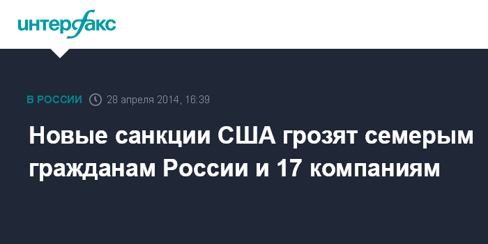 Москва. 28 апреля. INTERFAX.RU - Дополнительные санкции, которые США в понедельник собираются ввести против России, коснутся семи российских граждан и российских компаний, сообщает агентство Bloomberg со ссылкой на высокопоставленный источник в конгрессе, знакомый с планами Белого дома.