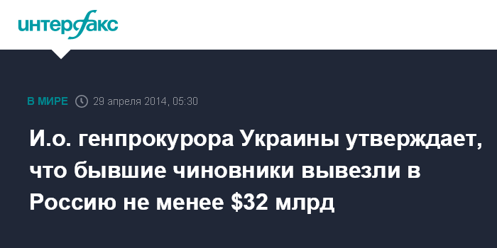 Москва. 29 апреля. INTERFAX.RU - Бывшие украинские чиновники вывезли в Россию минимум $ 32 млрд, заявил исполняющий обязанности генерального прокурора Украины Олег Махницкий в интервью британскому изданию "Financial Times", сообщает ГПУ.