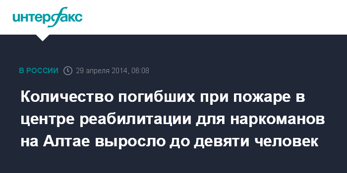 По данным следствия, утром в воскресенье в селе Озеро Красилово Косихинского района при возгорании здания реабилитационного центра погибли девять человек, проходивших психологическую реабилитацию от наркотической и алкогольной зависимости, еще шесть человек с различными травмами были госпитализированы в больницу.