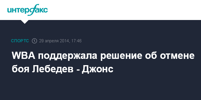 Москва. 29 апреля. INTERFAX.RU - Всемирная боксерская ассоциация (WBA) полностью поддержала решение промоутера Андрея Рябинского об отмене поединка между чемпионом мира в первом тяжелом весе по версии WBA россиянином Денисом Лебедевым и панамцем Гильермо Джонсом. Об сообщил российский менеджер Владимир Хрюнов.