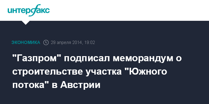 Москва. 29 апреля. INTERFAX.RU - "Газпром" подписал меморандум о строительстве австрийского участка газопровода "Южный поток", сообщил телеканал "Россия 24" с территории московского офиса концерна.