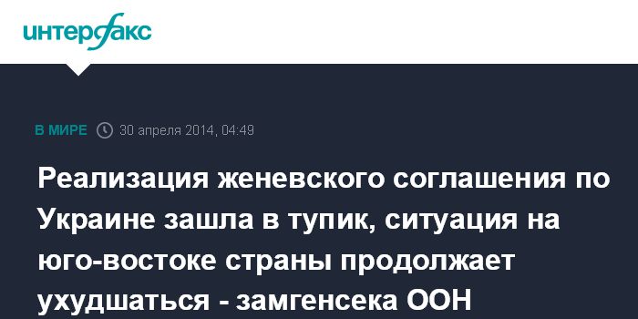Нью-Йорк (ООН). 30 апреля. INTERFAX.RU - Ситуация в ряде областей юго-восточной Украины продолжает ухудшаться на фоне отсутствия реализации договоренностей, достигнутых на четырехсторонней встрече в Женеве, заявил в среду заместитель генсека ООН по политическим вопросам Джеффри Фелтман.
