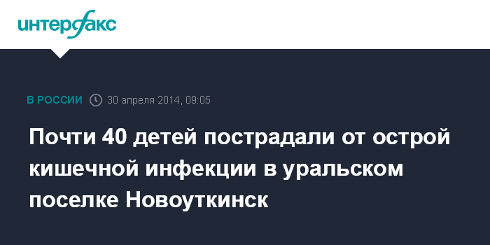 Москва. 30 апреля. INTERFAX.RU - В поселке Новоуткинск Свердловской области с 20 по 29 апреля было зарегистрировано 39 случаев острой кишечной инфекции, сообщает пресс-служба управления Роспотребнадзора по Свердловской области в среду.