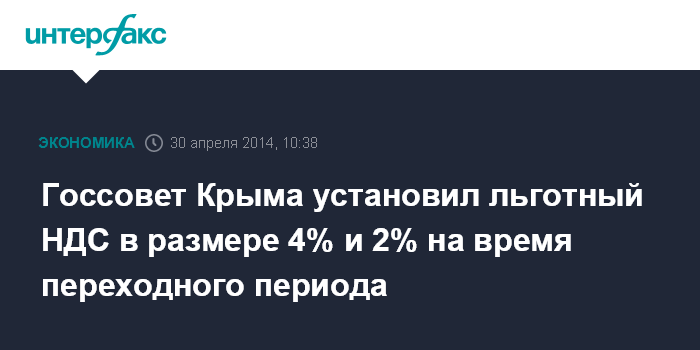 Москва. 30 апреля. INTERFAX.RU - Государственный совет республики установил на переходный период на территории республики ставки НДС в размере 4% и 2% вместо 18% и 10%, действующих на остальной территории России, передает в среду корреспондент "Интерфакса".