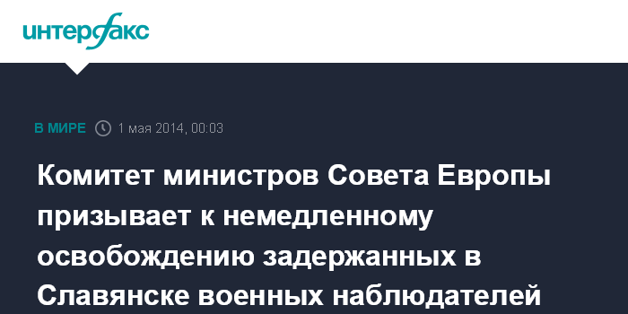 Комитет министров Совета Европы призывает к немедленному освобождению задержанных в Славянске военных наблюдателей ОБСЕ