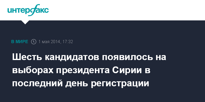 Москва. 1 мая. INTERFAX.RU - В последний день регистрации кандидатов в президенты Сирии заявки на участие подали еще шесть человек, сообщают в четверг официальные сирийские СМИ.