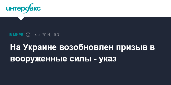Киев. 1 мая. INTERFAX.RU - И. о. президента Украины, председатель Верховной Рады Украины Александр Турчинов подписал указ "О мерах по повышению обороноспособности государства", которым, в частности, предусмотрено возобновление призыва в вооруженные силы.