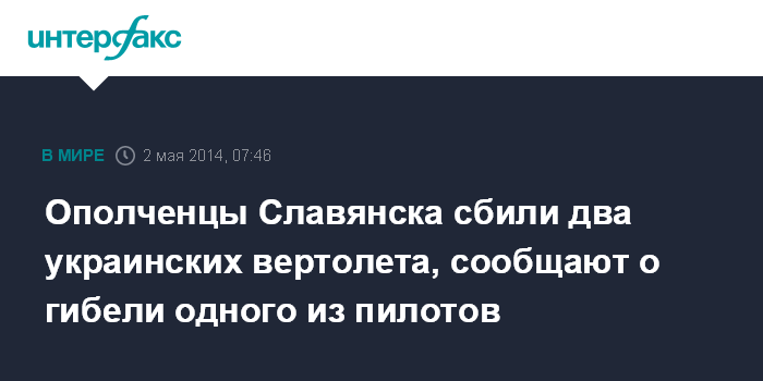 Москва. 2 мая. INTERFAX.RU - "Народный мэр" и лидер самообороны Славянска Вячеслав Пономарев сообщил о гибели пилота одного из двух сбитых ополченцами украинских вертолетов.