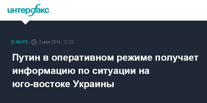 Москва. 2 мая. INTERFAX.RU - Президент России Владимир Путин в оперативном режиме получает всю информацию о развитии ситуации на юго-востоке Украины в связи с началом там карательной операции с задействованием вооруженных сил, а также боевой авиации, сообщил пресс-секретарь главы государства Дмитрий Песков.