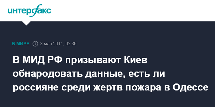 Москва. 3 мая. INTERFAX.RU - В МИД РФ призвали Киев обнародовать данные, есть ли россияне среди жертв пожара в Одессе, и предупредили, что в противном случае Москва сочтет это новой попыткой обвинить Россию во всем происходящем РФ.