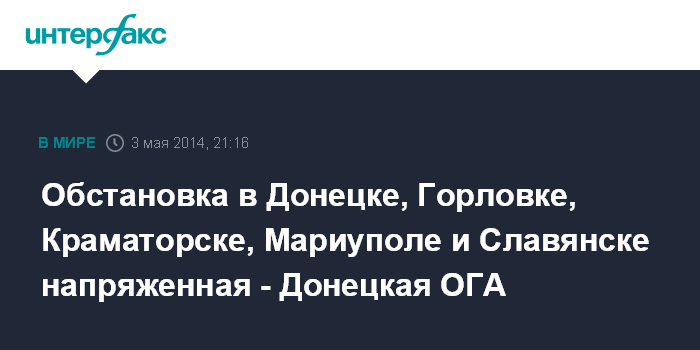 Донецк. 3 мая. ИНТЕРФАКС-УКРАИНА - Самой напряженной остается ситуация в Донецке, Горловке, Краматорске, Мариуполе, Славянске и Славянском районе (Донецкая обл.), возможно обострение ситуации в Дружковке и Константиновке, сообщает департамент внутренней политики Донецкой обладминистрации в отчете о текущей ситуации в регионе, опубликованном на временном сайте облгосадминистрации.
