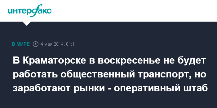 Киев. 4 мая. ИНТЕРФАКС-УКРАИНА - Оперативные службы Краматорска в ночь на воскресенье и днем 4 мая будут работать в штатном режиме, сообщает пресс-служба Донецкого областного совета со ссылкой на оперативный штаб Краматорского горсовета.