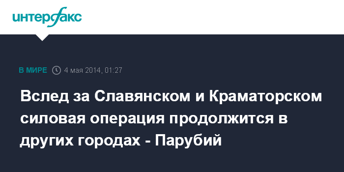 Киев. 4 мая. ИНТЕРФАКС-УКРАИНА - Силовая операция будет продолжаться не только в Славянске и Краматорске, но и в других городах Украины, сообщил секретарь Совета национальной безопасности и обороны Украины Андрей Парубий.