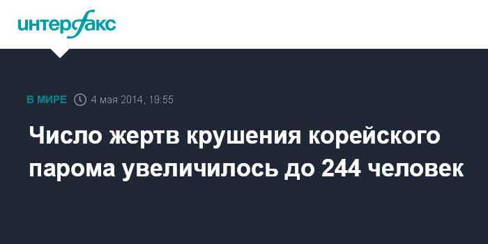 Москва. 4 мая. INTERFAX.RU - Подтвержденное число жертв крушения пассажирского парома "Севол" в Южной Корее достигло 244 человек, передает в воскресенье британская телерадиовещательная корпорация Би-би-си.