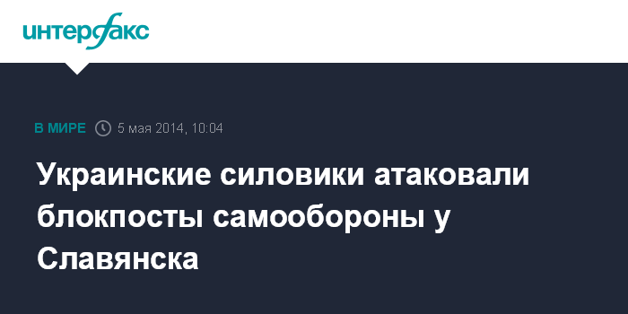 Москва. 5 мая. INTERFAX.RU - Украинские силовики атаковали блокпосты сил самообороны вокруг Славянска, сообщил "Интерфаксу" представитель штаба самообороны города.