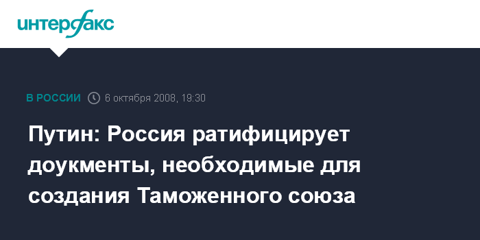 Москва. 6 октября. INTERFAX.RU - Председатель правительства РФ Владимир Путин заявил, что Россия в ближайшее время ратифицирует документы, необходимые для создания Таможенного союза.