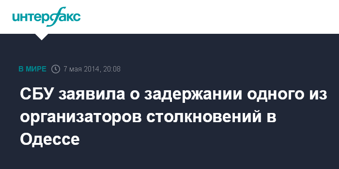 Москва. 7 мая. INTERFAX.RU - Служба безопасности Украины сообщила, что был задержан один из организаторов беспорядков 2 мая в городе Одесса, которые привели к многочисленным жертвам.