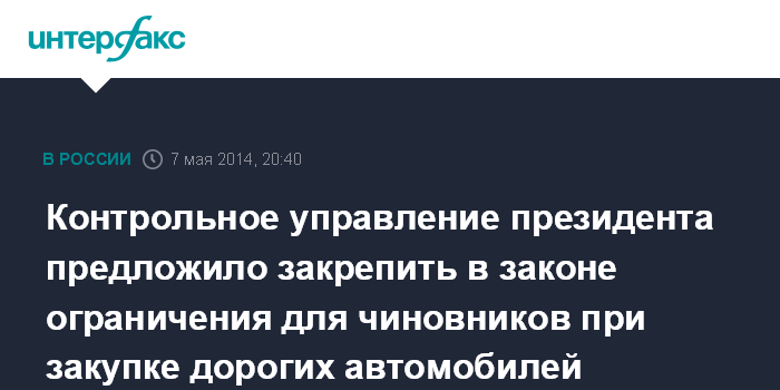 Москва. 7 мая. INTERFAX.RU - Контрольное управление президента предложило нормативно закрепить ограничения для чиновников при госзакупке дорогих автомобилей и обустройстве роскошных кабинетов, заявил глава управления Константин Чуйченко.