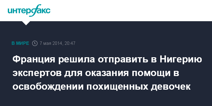 Москва. 7 мая. INTERFAX.RU - Франция отправят в Нигерию специалистов, которые будут участвовать в операции по освобождению из плена учениц, похищенных террористами из школы в середине апреля, заявил в среду глава МИД Лоран Фабиус.