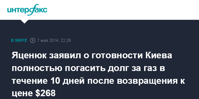 Москва. 7 мая. INTERFAX.RU - Украина готова полностью погасить задолженность за российский газ в течение 10 дней после того, как "Газпром" согласится вернуться к цене $268 за 1000 куб. м и подпишет соответствующее допсоглашение, заявил премьер-министр Арсений Яценюк.