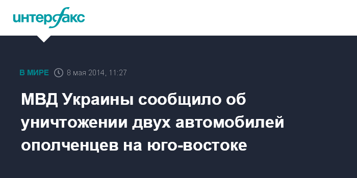 Москва. 8 мая. INTERFAX.RU - МВД Украины сообщило об уничтожении двух автомобилей нападавших на блокпост силовиков.