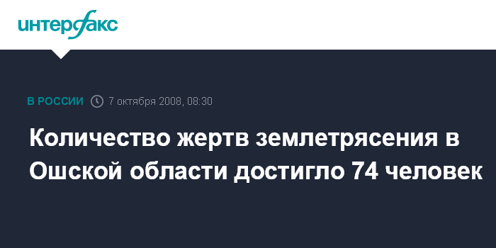 Москва. 7 октября. INTERFAX.RU - Жертвами разрушительного землетрясения, произошедшего в воскресенье на юге Киргизии, стали 74 человека, сообщила "Интерфаксу" пресс-секретарь Минздрава Елена Баялинова.