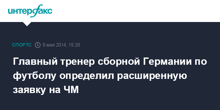 Москва. 8 мая. INTERFAX.RU - Главный тренер сборной Германии по футболу Йоахим Лев в четверг огласил имена футболистов, которые вошли в расширенную заявку национальной команды на чемпионат мира в Бразилии.