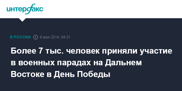 Хабаровск. 9 мая. INTERFAX.RU - Жители Дальнего Востока России первыми в стране встретили 69-ю годовщину Победы, во всех городах и районах прошли торжественные шествия, митинги, концерты, в четырех городах - военные парады.