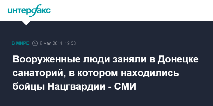 Москва. 9 мая. INTERFAX.RU - В Буденовском районе Донецка более сотни вооруженных людей захватили санаторий "Шахтерские зори", сообщает интернет-издание "Новости Донбасса".