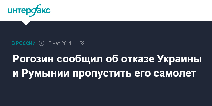 Москва. 10 мая. INTERFAX.RU - Спецпредставитель президента России по Приднестровью, вице-премьер Дмитрий Рогозин, который находится с визитом в Тирасполе, сообщает, что Украина и Румыния не пропускают его самолет через свое воздушное пространство. "Румыния по требованию США закрыла моему борту воздушное пространство. Украина снова не пропускает. В следующий раз полечу на ТУ-160", - написал Рогозин в своем микроблоге в твиттере в субботу.