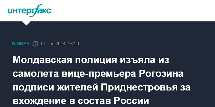 Москва. 10 мая. INTERFAX.RU - Из самолета вице-премьера РФ Дмитрия Рогозина, задержавшегося в Кишиневе по причине отказа в пролете над территорией Украины, изъяты более 30 тыс. подписей граждан Приднестровья, выступающих за присоединение к России.