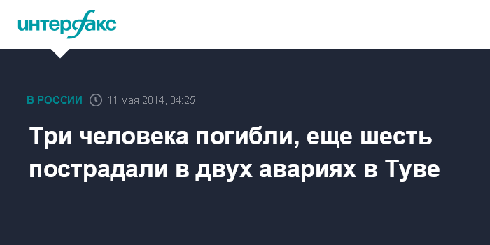 Москва. 11 мая. INTERFAX.RU - Три человека погибли в ДТП в Туве, сообщили "Интерфаксу" в пресс-службе республиканского МВД.