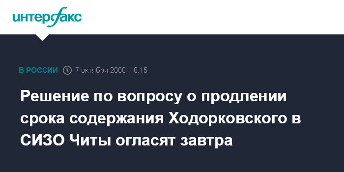 Москва. 7 октября. INTERFAX.RU - Читинский областной суд перенес на среду оглашение решения по ходатайству СКП РФ о продлении до 2 февраля 2009 г. срока содержания под стражей экс-главы НК "ЮКОС" Михаила Ходорковского.