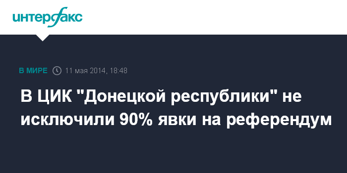 Москва. 11 мая. INTERFAX.RU - Глава ЦИК "Донецкой народной республики" Роман Лягин высказал предположение, что явка на референдуме превысит 90%. "Активность избирателей не снижается, несмотря на вечернее время. Изначально мы не ожидали столь высокой явки, однако теперь я могу предположить, что явка в конечном итоге перевалит за 90%", - отметил он.