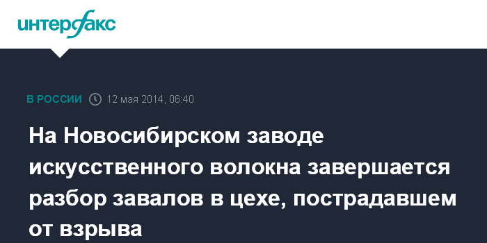 Москва. 12 мая. INTERFAX.RU - Разбор завалов в цехе Новосибирского завода искусственного волокна (НЗИВ), где вечером 7 мая прогремел взрыв, завершатся в ближайшее время, тела всех погибших извлечены, сообщил в понедельник агентству "Интерфакс-Сибирь" главный инженер предприятия Виктор Ваньков.
