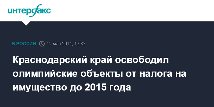 Москва. 12 мая. INTERFAX.RU - Краснодарский край освободил объекты зимней Олимпиады в Сочи от уплаты налога на имущество организаций с 1 января 2013 года до 1 января 2015 года, сообщается на сайте регионального министерства финансов.