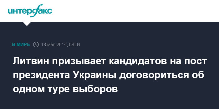 Москва. 13 мая. INTERFAX.RU - Председатель комитета Верховной Рады по вопросам национальной безопасности и обороны, бывший спикер парламента Владимир Литвин считает, что кандидаты в президенты должны договориться об одном туре президентских выборов, сообщает пресс-служба политика.
