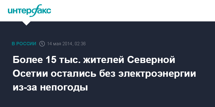 Владикавказ. 14 мая. ИНТЕРФАКС-ЮГ - Жители восьми населенных пунктов Моздокского района Северной Осетии остались без электроснабжения в результате сильного дождя с ветром, сообщили агентству "Интерфакс-Юг" в пресс-службе ГУ МЧС по республике.