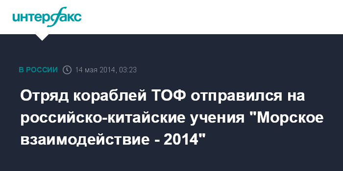 Владивосток. 14 мая. ИНТЕРФАКС - ДАЛЬНИЙ ВОСТОК - Отряд кораблей Тихоокеанского флота (ТОФ) в среду вышел из Владивостока и взял курс на Шанхай, чтобы принять участие в масштабных учениях с ВМС Народно-освободительной армии Китая "Морское взаимодействие - 2014".
