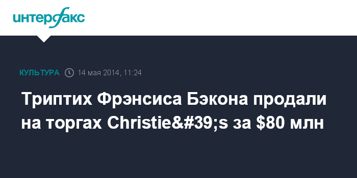 Москва. 14 мая. INTERFAX.RU - Картина британского художника-экспрессиониста Фрэнсиса Бэкона "Три наброска к портрету Джона Эдвардса" во вторник, 13 мая, была продана на торгах Christie's в Нью-Йорке за $80,8 млн долларов. Об этом сообщается на сайте аукционного дома.