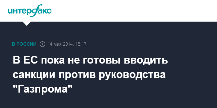 Москва. 14 мая. INTERFAX.RU - Руководителей "Газпрома" на данном этапе не планируется вносить в санкционный список Евросоюза. Об этом заявила в среду на брифинге в Брюсселе Майя Косьянчич, официальный представитель главы дипломатии ЕС Кэтрин Эштон. По ее словам, пока невозможно сказать, кого ограничительные меры коснутся в дальнейшем.