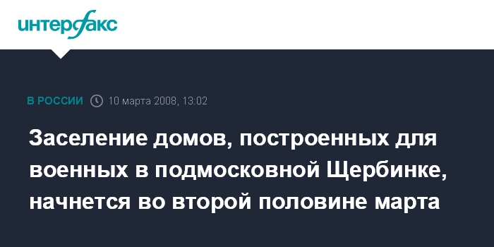 Щербинка. 10 марта. ИНТЕРФАКС-ЦЕНТР - Во второй половине марта будет начато заселение домов, построенных для военнослужащих в подмосковной Щербинке, сообщил журналистам в понедельник первый заместитель руководителя департамента градостроительной политики города Москвы Александр Косован.