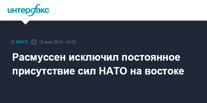 Москва. 15 мая. INTERFAX.RU - Генсек НАТО Андерс Фог Расмуссен назвал вопрос о размещении на постоянной основе сил НАТО на востоке Европы теоретическим. С таким заявлением он выступил в четверг в Братиславе.