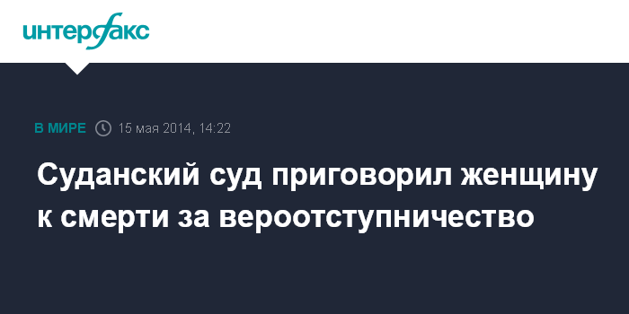 Москва. 15 мая. INTERFAX.RU - Суданский суд приговорил беременную женщину к казни через повешение за вероотступничество после того, как она перешла из ислама в христианство.