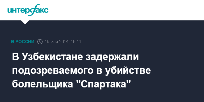 Москва. 15 мая. INTERFAX.RU - Правоохранительные органы задержали в Узбекистане подозреваемого в непредумышленном убийстве спартаковского болельщика Леонида Сафьянникова из Подмосковья, сообщил в четверг "Интерфаксу" источник, знакомый с ситуацией.