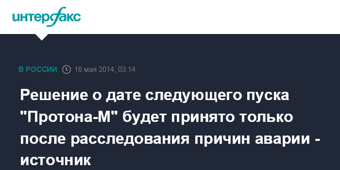 Решение о дате следующего пуска "Протона-М" будет принято только после расследования причин аварии - источник